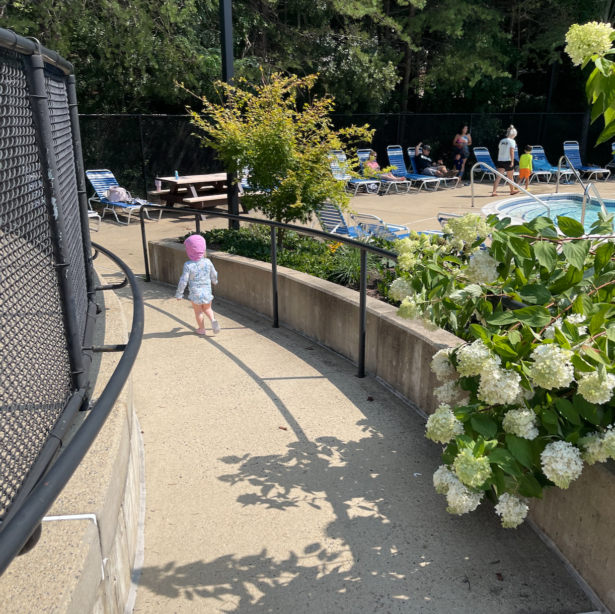 Heading into toddler swim class, summer 2024. Signing up for daily early morning class while only 2 months postpartum was its own interesting lesson in rest amidst chaos.